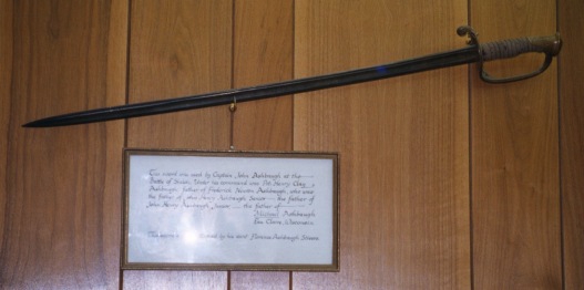 | The Sword of Capt. L. S. Ashbaugh This sword was used by Capt. Lewis Sells Ashbaugh in the Civil War. The inscription on the plaque below the sword says, "This sword was used by Captain John Ashbaugh (1821-1881) at the Battle of Shiloh. Under his command was Pvt. Henry Clay Ashbaugh, fath |  |